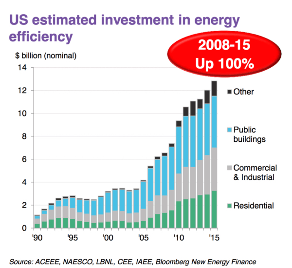Finally, while high-visibility technologies like solar and wind and electric cars dominate the headlines, we’re seeing a continued explosion of the cheapest and cleanest source of electricity — using energy more efficiently, such as by replacing traditional lighting with LED bulbs.