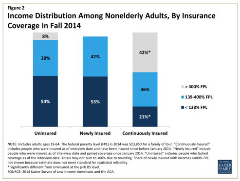 According to Kaiser researchers, who surveyed a representative sample of more than 10,000 adults, most of the uninsured people in the country have incomes that qualify them to receive financial assistance under Obamacare. They could either get subsidies to help them purchase private plans on the new state-level marketplaces, or they could enroll in public plans in their state’s expanded Medicaid program.