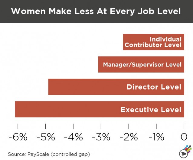 Some also posit that women make less because they lack enough ambition to get ahead. But women can’t outrun the wage gap by climbing to the top. The controlled gap exists at every job level and even widens as they get further ahead. Entry-level women make 2.2 percent less, while executives make 6.1 percent less.