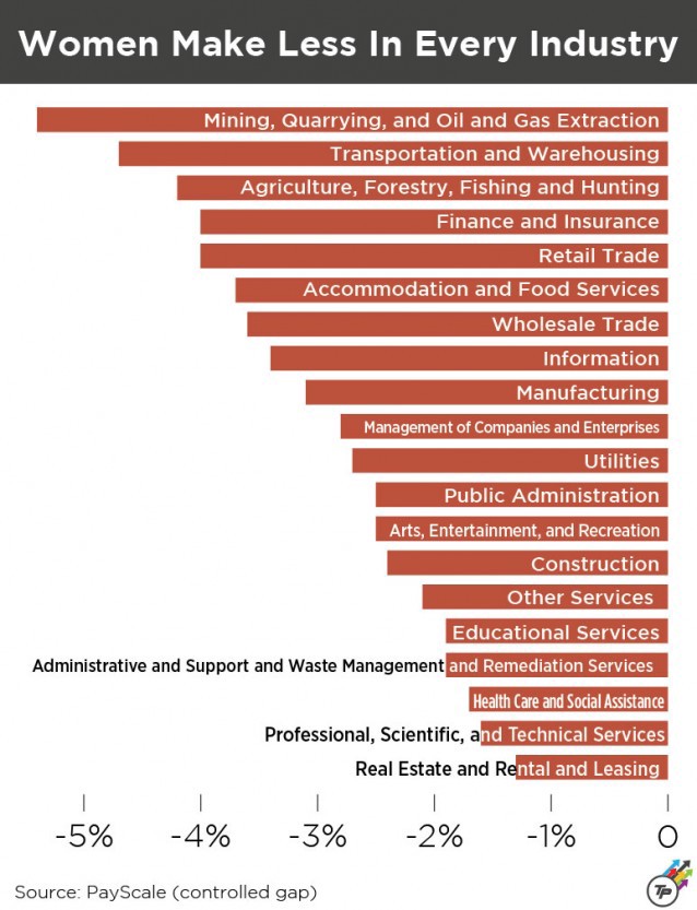 Overall, women tend to be clustered in lower paying jobs than men. Male-dominated jobs pay a lot more per week than female ones. But women still can’t escape the pay gap by taking a job in a new area. Even when controlled for different factors, there is no industry where women earn equal or more than compared to men. Women make between 1.3 percent less than men in the real estate industry and 5.4 percent less in mining, quarrying, and oil and gas.