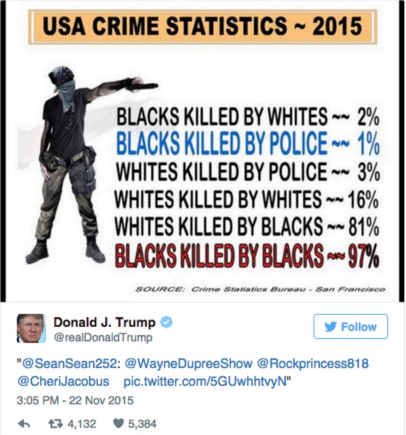 This account was the originator of a fake, racist meme that claimed 81% of whites are killed by blacks. (The actual percentage is 14%.) Trump tweeted the graphic.