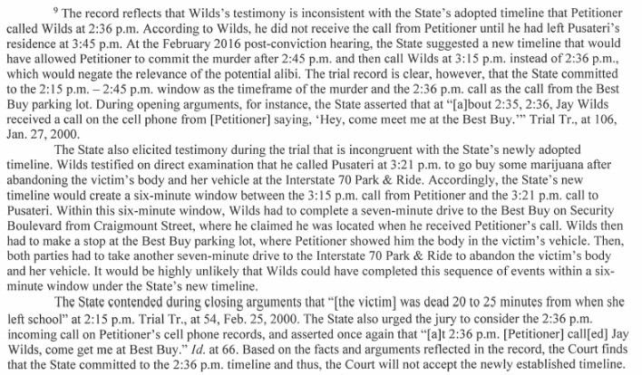 The fax cover sheet would make it difficult for the state to persuasively introduce the cell phone evidence at a new trial. That leaves prosecutors with Wilds’ testimony. But Wilds’ testimony is a mess and, as Judge Welch points out, completely inconsistent with the timeline prosecutors presented at trial or a new timeline that prosecutors suggested during the appeal.