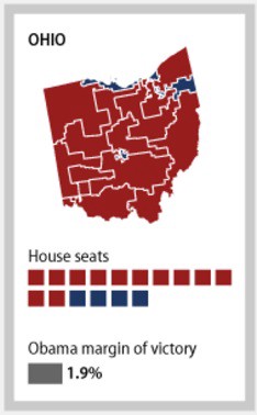 Even if Kasich, who is an underdog in the race for his party’s presidential nomination, only manages to put in place redistricting reform in his own state, that could shift the balance of power in the U.S. House of Representatives. Ohio’s maps all-but-ensure that the GOP will dominate the state’s congressional delegation. In the last presidential election, President Obama carried the state, but Republicans still captured 12 of Ohio’s 16 congressional districts: