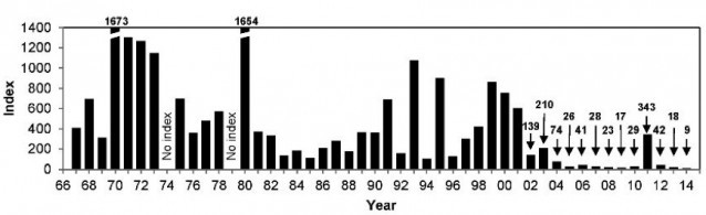 Delta smelt annual abundances as determined by fall mid-water trawl surveys.