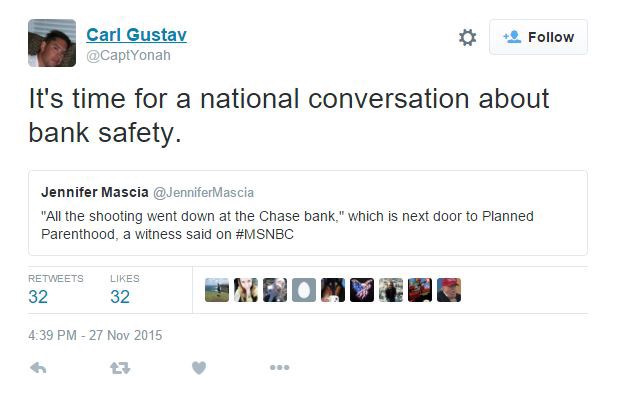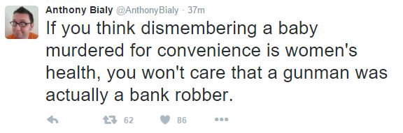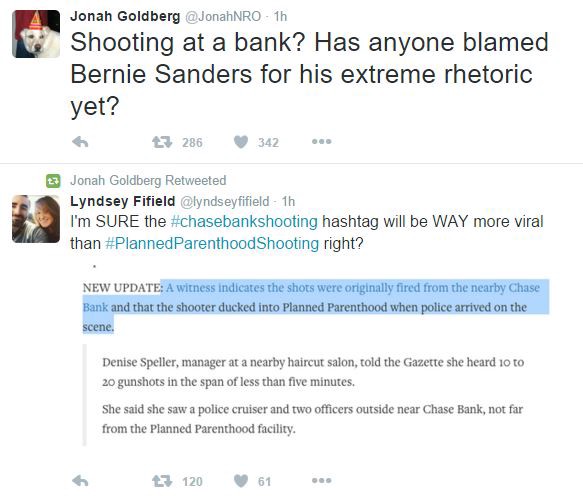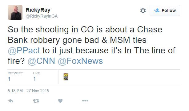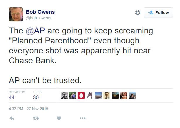 And Erick Erickson, the editor-in-chief of RedState.com, walked back his initial comments about the shooting after it became clear that it was not actually a bank robbery. He initially tweeted, “Left upset the only people dying at Planned Parenthood today are babies. They were hoping for Christian shooters to narrative shift Paris.” Following later reports that the shooting was indeed inside a Planned Parenthood clinic, he wrote, “I deleted that tweet. Prayers for the police and victims offered instead.”