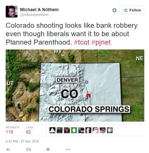 Though it does remain unclear whether Dear was attempting to specifically target the Colorado Springs abortion clinic, it’s not true that Planned Parenthood supporters are overreacting to an incident that happened at a bank. Police officers have confirmed that “the entire incident took place at the Planned Parenthood clinic.”