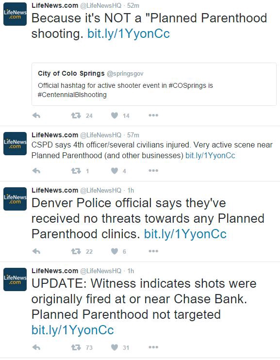 Initially, when police officers were involved in a stand-off with Dear and information about the event was murky, early reports from Fox News quoted a witness who suggested that the first shots were fired from a bank. The anti-abortion website LifeNews picked up that story, spurring the bank robbery narrative.