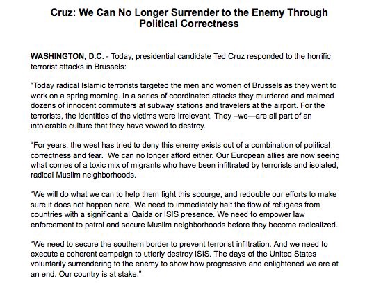 In a statement on the bombings of the Brussels airport and a subway station that killed at least 31 people, Cruz vowed to end the “political correctness” he believes is endangering Americans. Along with stepping up security at the Mexican border and refusing refugees, “we need to empower law enforcement to patrol and secure Muslim neighborhoods before they become radicalized,” the senator said.