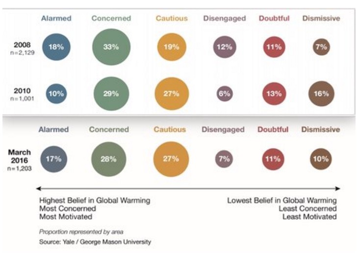 These findings — and these categories — come from a new analysis of the opinions of some 1200 Americans taken in March and unveiled this week by the Climate Change Communication programs at Yale and George Mason University (GMU). Here is a comparison of some key findings of theirs over the years:
