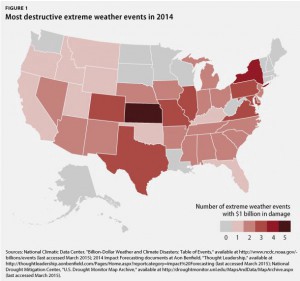 Titled “Extreme Weather on the Rise,” the report found that the U.S. experienced eight total extreme weather events in 2014, and that each of those disasters caused at least $1 billion in damage. Those events — which included historic drought, flooding, and storms — affected 35 states in total. In the last four years, the report found, extreme weather events across the United States caused 1,286 fatalities and $227 billion in economic losses across 44 states.
