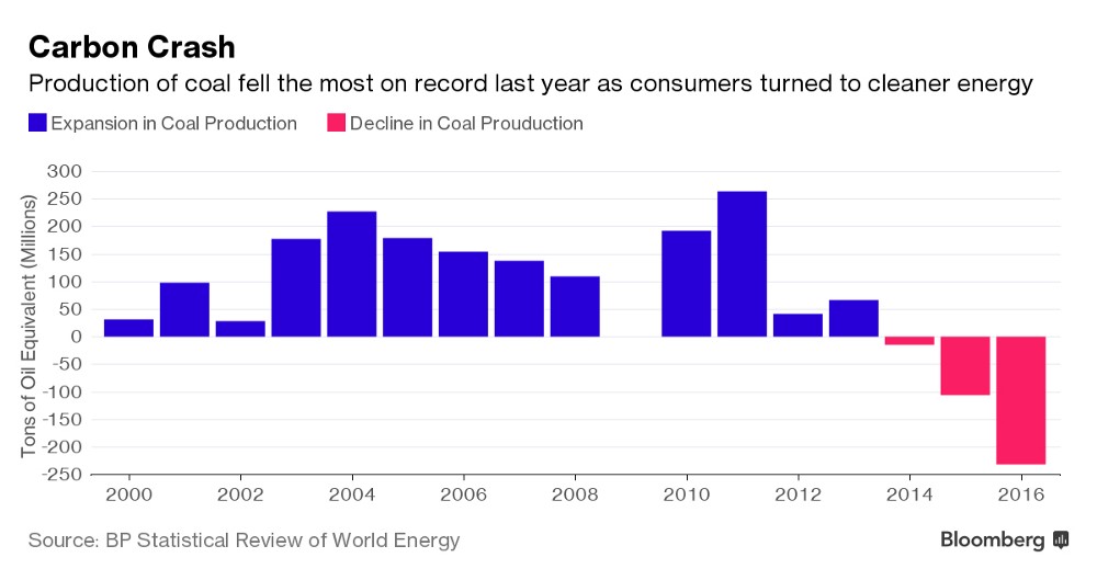 World coal production had its biggest drop ever last year, 230 million tons of oil equivalent (mtoe), BP reported Tuesday in its 2017 Statistical Review of World Energy. China led the way with a 7.9 percent decline in coal production (140 mtoe), followed by the U.S. with a 19 percent drop (85 mtoe).