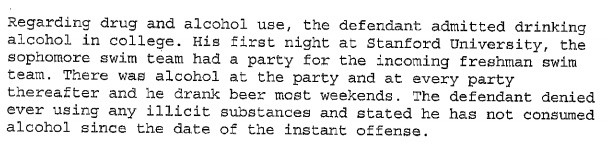 Brock never used illicit drugs and never used alcohol prior to attending Stanford.