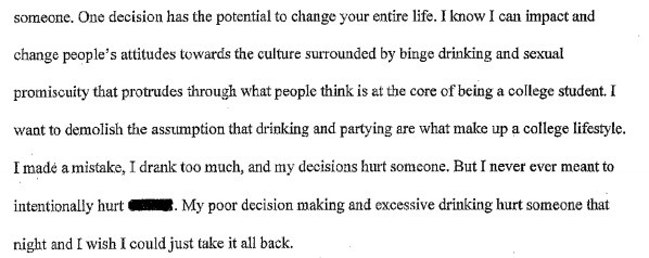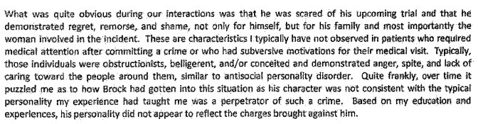 This is questionable since Brock also claims that the victim was conscious and consented to all sexual activity that evening. He expressed remorse for drinking.