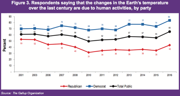 First, the bad news. Researchers have found there has been a small uptick in the number of Americans who understand that humans are driving climate change — but most of the gains have been made among Democrats. Republicans are actually less likely to accept climate science than they were 15 years ago. Thus, while public opinion in the aggregate is moving in the right direction, the issue has also become more polarized.