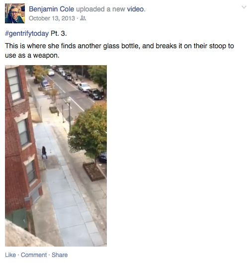 As ThinkProgress reported Thursday morning, Benjamin Cole, a former Baptist pastor and energy industry spokesman, posted a series of videos and comments on October 13, 2013 mocking two African Americans outside his DC apartment. In the first, he compared them to animals escaping from the National Zoo engaged in “mating rituals.” That message included a video of a woman, shouting and seemingly engaged in an argument with someone not visible as she walked. In each of his posts, he used the hashtag “#gentrifytoday.”