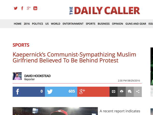 Then last week, The Daily Caller posted a short entry alleging that Kaepernick’s national anthem protest was somehow the brainchild of Kaepernick’s “communist-sympathizing Muslim girlfriend,” citing the same outdated and anonymous sports gossip entry.