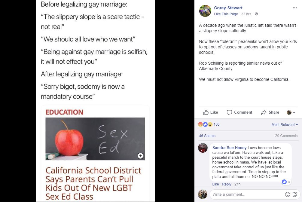 On Tuesday, Stewart shared a Facebook post lashing out at the “lunatic left” for not allowing parents to opt kids out of public school classes that teach “sodomy.” His comment accompanied a graphic that said, “Sorry bigot, sodomy is now a mandatory course” and a screenshot of a Daily Caller headline suggesting California parents can’t pull kids out of a new “LGBT sex ed class.”
