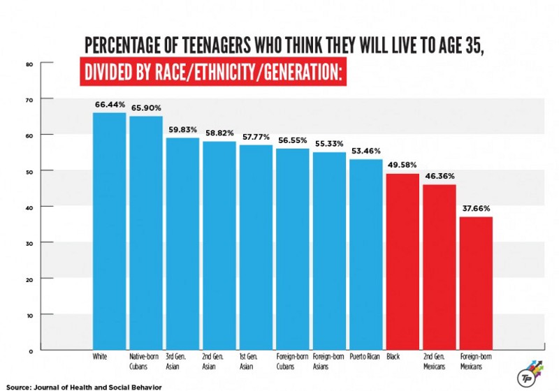 In a way, these pessimistic expectations are linked to reality: Black Americans, who are at a higher risk of incarceration, are also at a higher risk of the associated economic burdens, psychological stresses, and health issues that accompany spending time behind bars. Constant economic stress contributes to a host of illnesses, and is as draining as constantly pulling all-nighters. Even among white Americans, wealthy Americans are healthier and live-longer than their working-class counterparts. And on top of that, Black and Latino youths often have to contend with the stress of daily racial discrimination, which can cause mental and physical trauma.