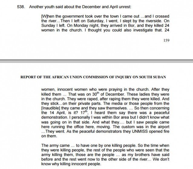 “[T]he fact that the AU body rejects President Kiir’s coup claim, and holds his forces responsible for organized killings in the very first days of the war, will shape how the rest of the world and future generations allocate blame for the conflict,” he said, but also noted that Machar’s forces should not be absolved of blame.
