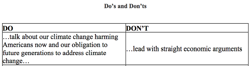 The second messaging problem is that Obama started his address by talking about the economy. Team Obama knows the economic argument is not the one to lead with — the moral argument is. How do I know they know this? Because team Obama finally figured it out two years ago and leaked it to the world around the time of his in his big June 2013 climate speech (see “Moral Majority: Team Obama Finally Embraces The Winning Argument For Climate Action”).
