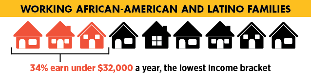 Families of color are also likely to fall to the very bottom of the income ladder and rare at the top. More than a third of African-American and Latino working families fall into the lowest income bracket, making less than $32,000 a year. Just 13 percent of white and Asian-American families find themselves in that group.