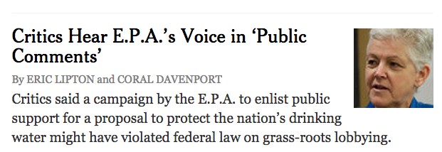 The Times waits until the last two paragraphs to let EPA officials make this rather obvious point: “they did not violate the Anti-Lobbying Law because they never explicitly urged the public to lobby Congress.” The EPA has been doing its job.