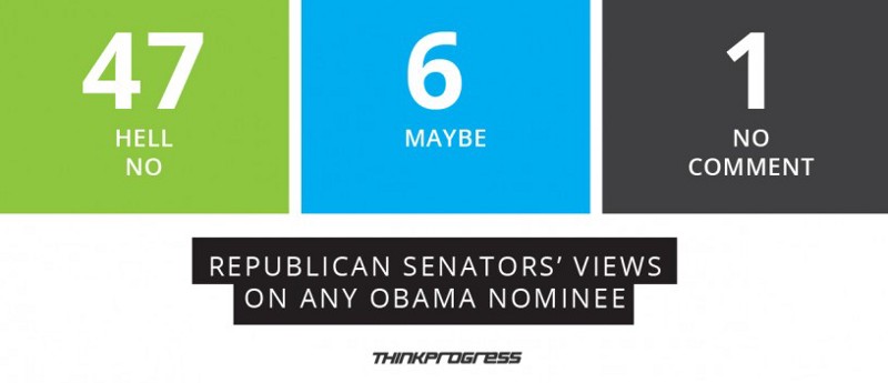 But shortly after the news broke last week that Justice Antonin Scalia, one of the Court’s most outspoken conservatives, had died, Republican senators immediately made it known they would oppose any nominee President Obama sent their way and, what’s more, that they believe the seat should remain vacant until the next president takes office. While all 46 Senate Democrats and independents have called for Obama to nominate a replacement for Scalia, 47 of the 54 Senate Republicans stand in opposition to any Obama appointment at all, while 6 expressed some willingness to consider an Obama nominee and 1 has not said anything on the matter.