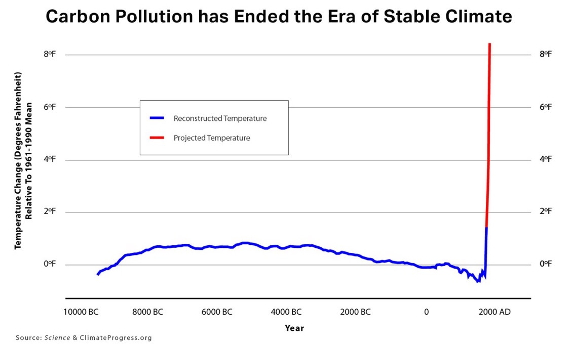 First, in recent years, research has made it increasingly clear that — after an 11,000 year period of relative stability — the climate has become destabilized by human emissions of carbon pollution, putting us on a path towards steadily rising temperatures throughout the century.