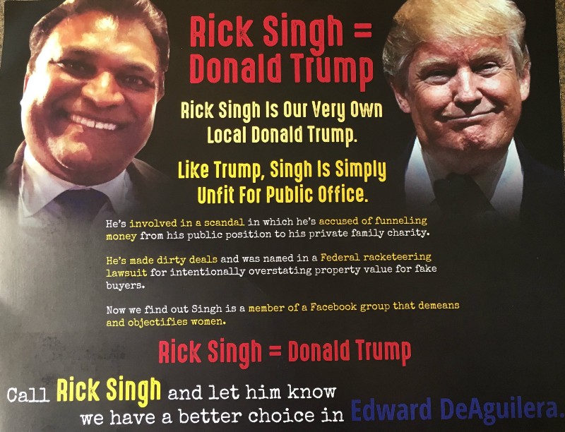 One side of the mailer features half of Singh’s head next to half of Trump’s, and the other declares that “Like Trump, Singh is simply unfit for public office.”