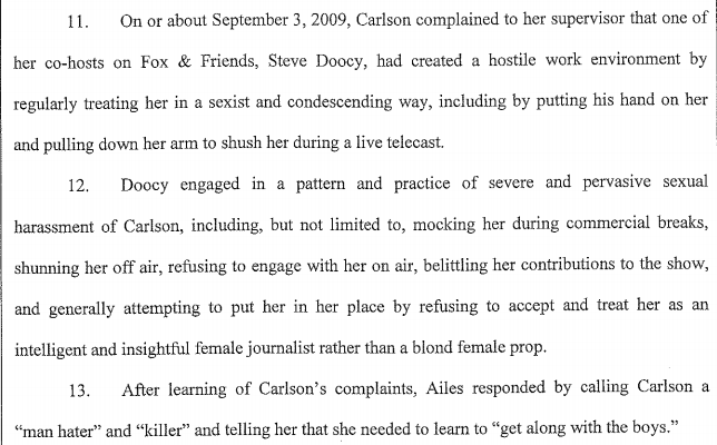 Carlson joined Fox News in 2005 and began co-hosting “Fox & Friends” in 2006. In September of 2009, the lawsuit says she complained to her supervisor that her co-host Steve Doocy “regularly treat[ed] her in a sexist and condescending way,” including putting his hand on her or pulling her arm to quiet her during live shows. She also claims he mocked and shunned her off air, belittled her, refused to engage with her on air, and “generally attempt[ed] to put her in her place by refusing to accept and treat her as an intelligent and insightful female journalist rather than a blond female prop.”