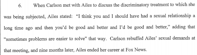 In September of last year, Carlson met with Ailes to complain about the discriminatory treatment and sexual harassment she felt she was receiving from coworkers. According to the lawsuit, Ailes responded, “I think you and I should have had a sexual relationship a long time ago and then you’d be good and better and I’d be good and better,” adding, “sometimes problems are easier to solve” that way. She says she refused his advances.