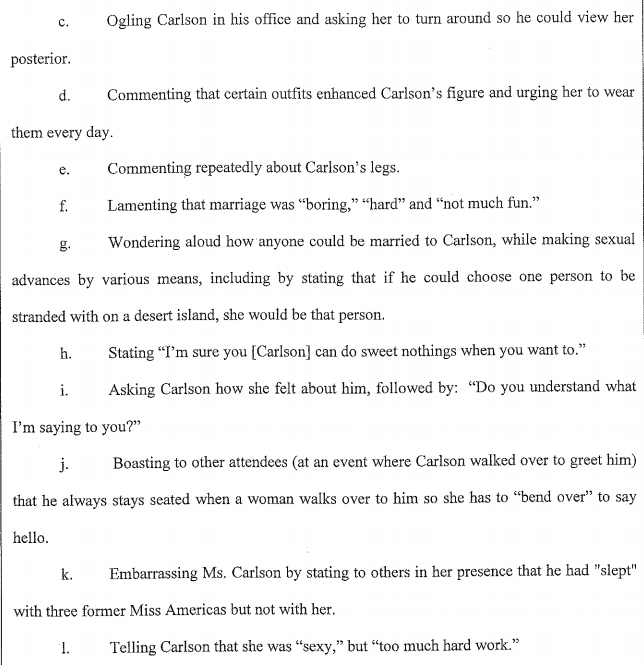 The lawsuit makes a number of other claims about the way Ailes treated her, including telling her to turn around in his office so he could see her backside, saying she was “sexy” but “too much hard work,” commenting on her legs, and urging her to wear outfits every day that he said enhanced her figure. She also alleges he told her she saw things as though it “only rains on women” and told her to stop worrying about getting “offended so God damn easy about everything.” He also told her she tried to “show up the boys” on “Fox & Friends.”