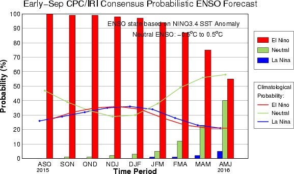 “There is an approximately 95% chance that El Niño will continue through Northern Hemisphere winter 2015–16, gradually weakening through spring 2016,” according to NOAA’s CPC and Columbia’s International Research Institute (IRI) for Climate and Society. There’s a 75 percent chance we’ll still have El Niño conditions in the March-April-May timeframe.