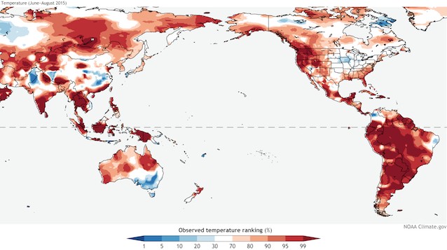 Of course there are many variables that could affect temperatures in 2016, including the ever-present possibility of a major volcanic eruption. Right now, though, it looks like we will be setting 12-month temperature records through spring 2016 — and that summer 2016 could be hotter than this summer, which was pretty darn hot worldwide as the CPC/IRI report shows: