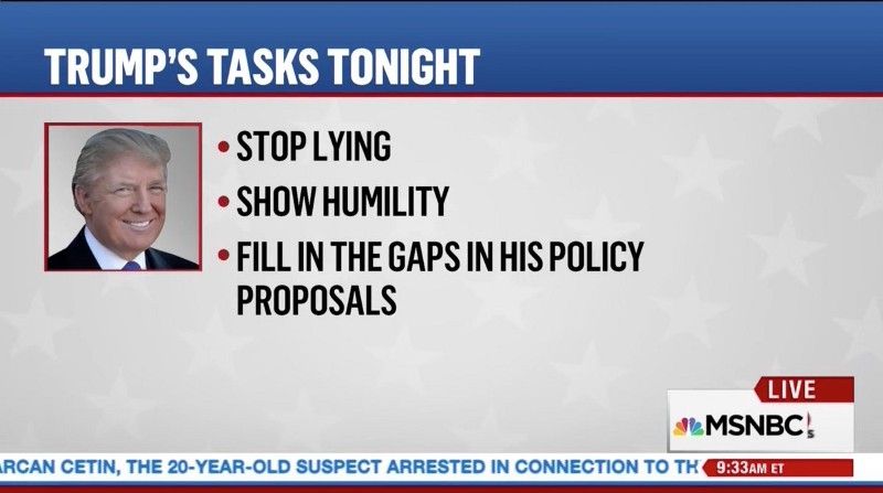 In MSNBC’s estimation, Clinton has to explain her entire vision for the country to viewers. Trump, by contrast, just has to get through 90 minutes without lying.