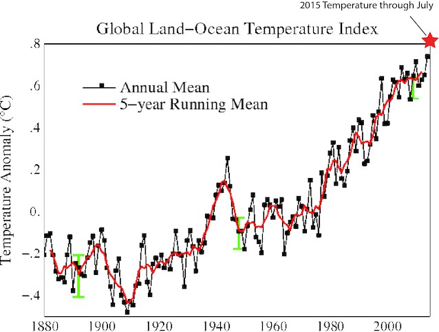NASA reports this was the hottest July on record. So we are now in “bet the mortgage” territory that 2015 will be the hottest year in NASA’s 125-year temperature record.