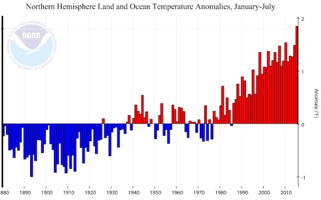 It was especially hot for the 6 billion of us up here in the northern hemisphere, where the first seven months of 2015 were a remarkable 0.3°F warmer than the first seven months of any year on record — and nearly a half degree Fahrenheit warmer than any year before 2007: