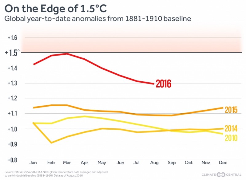 Avoiding that unseen territory — along with multiple catastrophic impacts — is a key reason the world unanimously committed in Paris last year to an ongoing effort of increasingly deeper carbon dioxide cuts aimed at keeping total warming “to well below 2 degrees C [3.6 degrees F] above preindustrial levels.” The parties even agreed “to pursue efforts to limit the temperature increase to 1.5 degrees C above preindustrial levels, recognizing that this would significantly reduce the risks and impacts of climate change.”