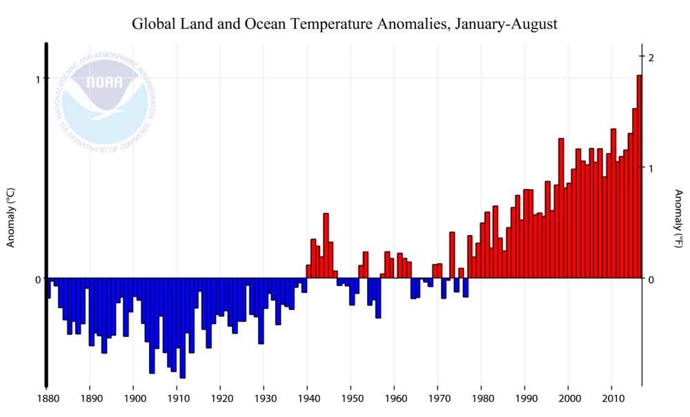 NOAA points out that August marks “16 months of record warmth for the globe, the longest such streak in 137 years.” No surprise then that, so far, this is easily the warmest year on record: