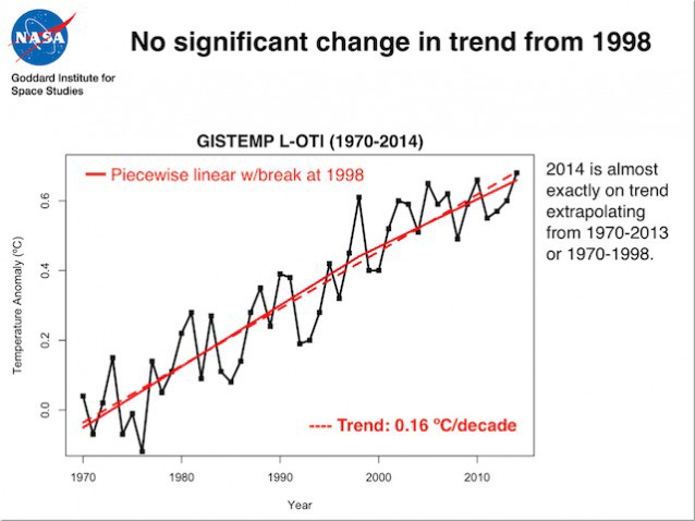 Dr. Gavin Schmidt, director of NASA’s Goddard Institute of Space Studies, tweeted last week “Is there evidence that there is a significant change of trend from 1998? (Spoiler: No.)” He attached this chart, which uses NASA’s latest data: