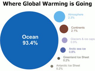 Remember, more than 90 percent of human induced planetary warming goes into the oceans, while only 2 percent goes into the atmosphere, so small changes in ocean uptake can have huge impact on surface temperatures. That’s a key reason surface temperatures haven’t appeared to warm as fast as many had expected in the past ten years — although ocean warming has sped up, and sea level rise has accelerated more than we thought , and Arctic sea ice has melted much faster than the models expected, as have the great ice sheets in Greenland and Antarctica