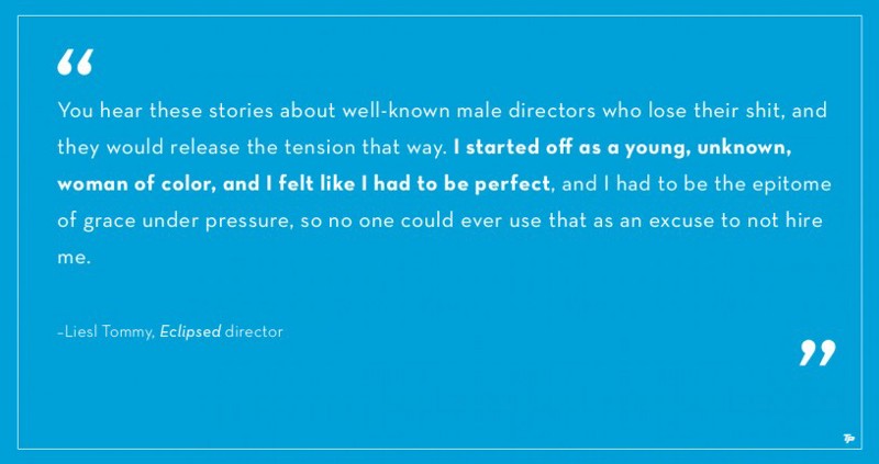 You know, in the past, absolutely, 100 percent, I did feel that. I used to feel really strongly about being super-controlled, never losing my temper in tech, which is a very high-stress situation. And you hear these stories about well-known male directors who lose their shit, and they would release the tension that way. I started off as a young, unknown, woman of color, and I felt like I had to be perfect, and I had to be the epitome of grace under pressure, so no one could ever use that as an excuse to not hire me.