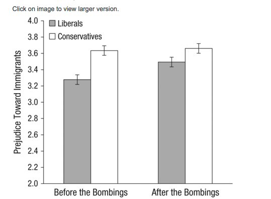 For example, levels of prejudice toward immigrants among liberals more closely aligned with those of conservatives after the bombings.