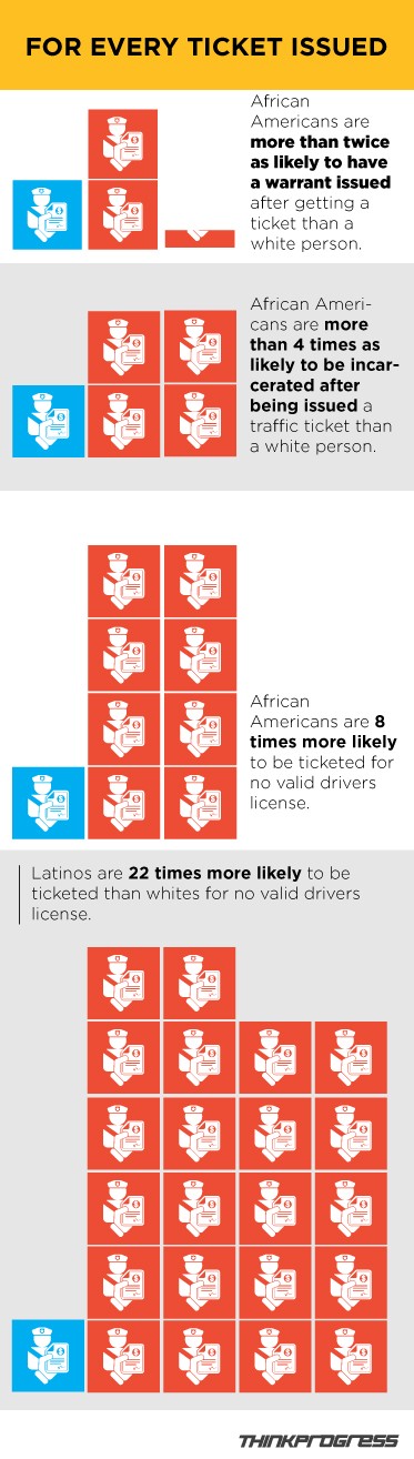 African-Americans are 4.11 times more likely to be incarcerated after being issued a traffic ticket than whites. After a warrant was issued, African-Americans were 1.8 times more likely to be incarcerated than whites and 1.65 times more likely than Hispanics. African-Americans were still 1.63 times more likely to be incarcerated after a ticket was issued compared to whites and Hispanics put together.