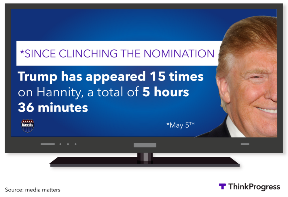 Meanwhile, his campaign — which still lacks a field operation and other essential functions — has turned into an extended episode of Hannity. Since May 5, when John Kasich dropped out, Hannity’s show has featured Trump interviews 15 times, consuming over five-and-a-half hours of airtime, according to data provided to ThinkProgress by Media Matters.