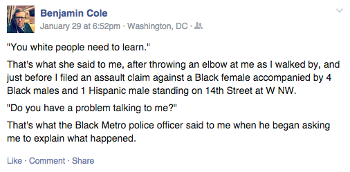 Last month, he posted on Facebook describing an issue he’d had with an African American police officer after being assaulted by an African American female.