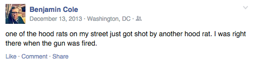 BuzzFeed’s Andrew Kaczynski unearthed some additional Cole posts on Thursday, including a follow-up comment on his post from January about his interaction with a DC policewoman. In it, he wrote that he is “all too worried about the deportables, as you know. I am doing, however, my absolute best to put as many Black criminals who live and loiter on my street behind bars. And if I found any White, Hispanic, Arab, Aleutian, Islander, or other such race causing mischief in my neighborhood, I would pursue their arrest, prosecution, and imprisonment as well.”