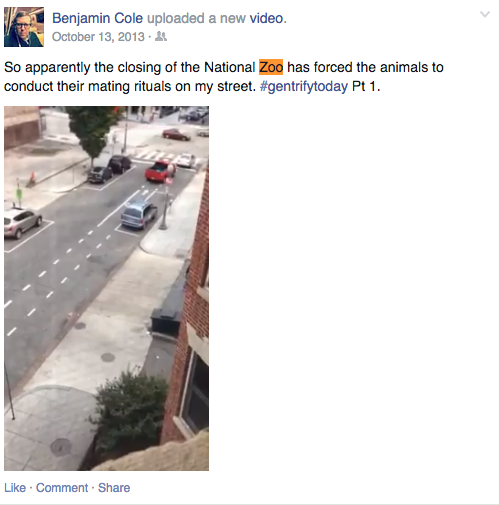 Benjamin Cole, a former Baptist pastor and energy industry spokesman, posted a series of videos and comments on October 13, 2013 mocking two African Americans outside his DC apartment. In the first, he compared them to animals escaping from the National Zoo engaged in “mating rituals.” That message included a video of a woman, shouting and seemingly engaged in an argument with someone not visible as she walked. In each of his posts, he used the hashtag “#gentrifytoday.”