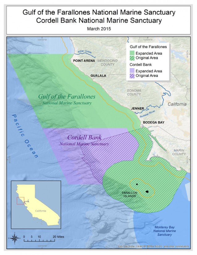 The Obama Administration has announced plans to nearly triple the size of two major marine sanctuaries off the coast of Northern California. After more than a decade of public comment and research by the National Oceanic and Atmospheric Administration (NOAA), Cordell Bank National Marine Sanctuary will expand from 529 square miles to 1,286 square miles and the Gulf of the Farallones National Marine Sanctuary will expand from 1,282 square miles to 3,295 square miles. Together, the two sanctuaries will be nearly the size of Connecticut. When combined with the nearby Monterey Bay National Marine Sanctuary, a a stretch of more than 150 miles of coastal waters will now be protected.