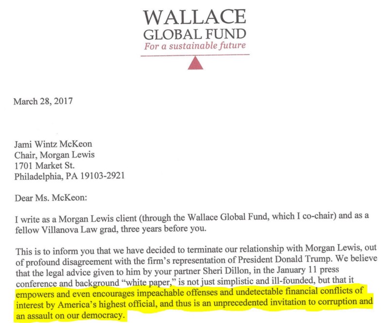 Now, one of Morgan Lewis’ clients has had enough. In its letter, the Wallace Global Fund accuses Morgan Lewis of abetting “corruption and an assault on our democracy.”